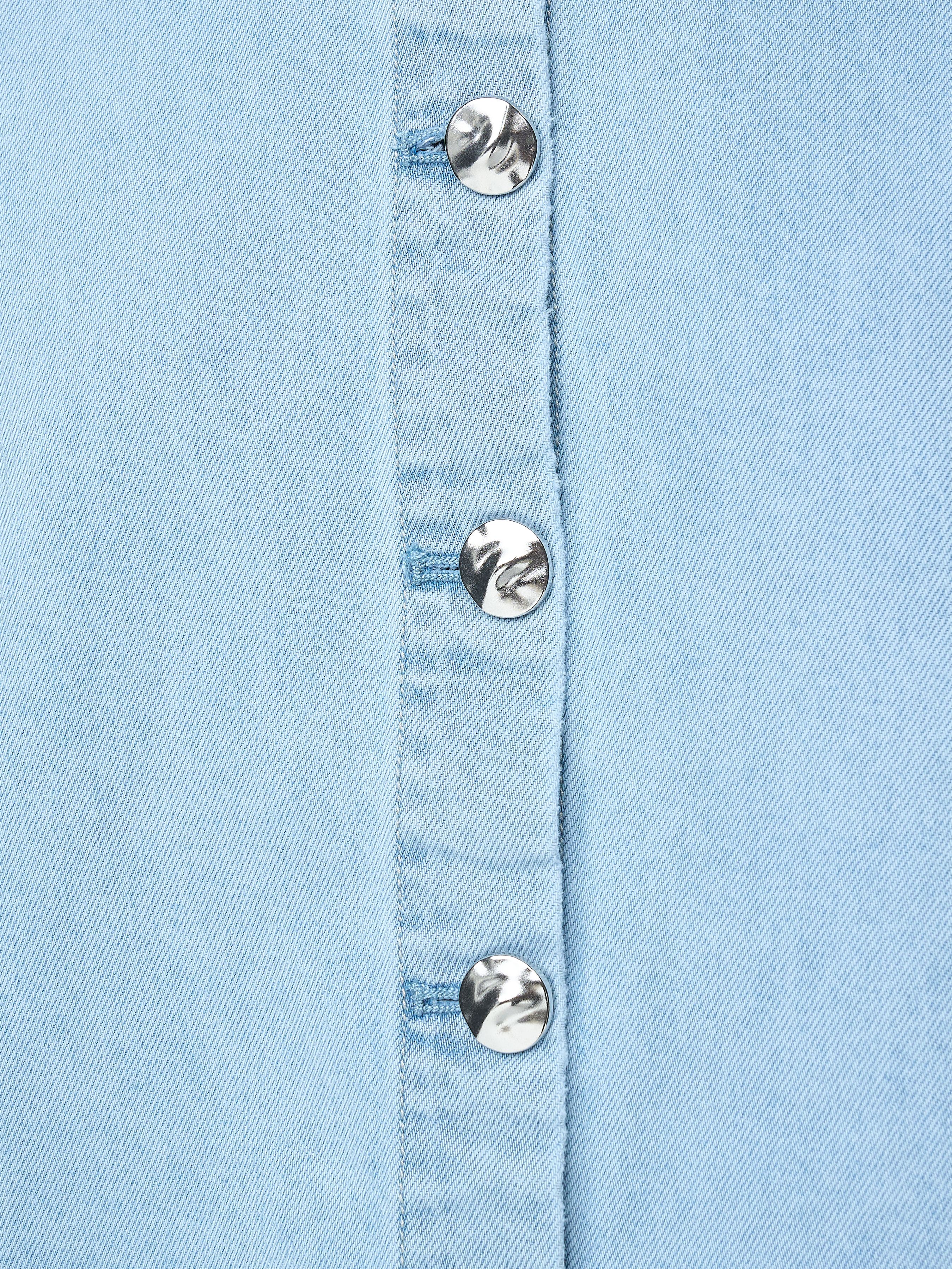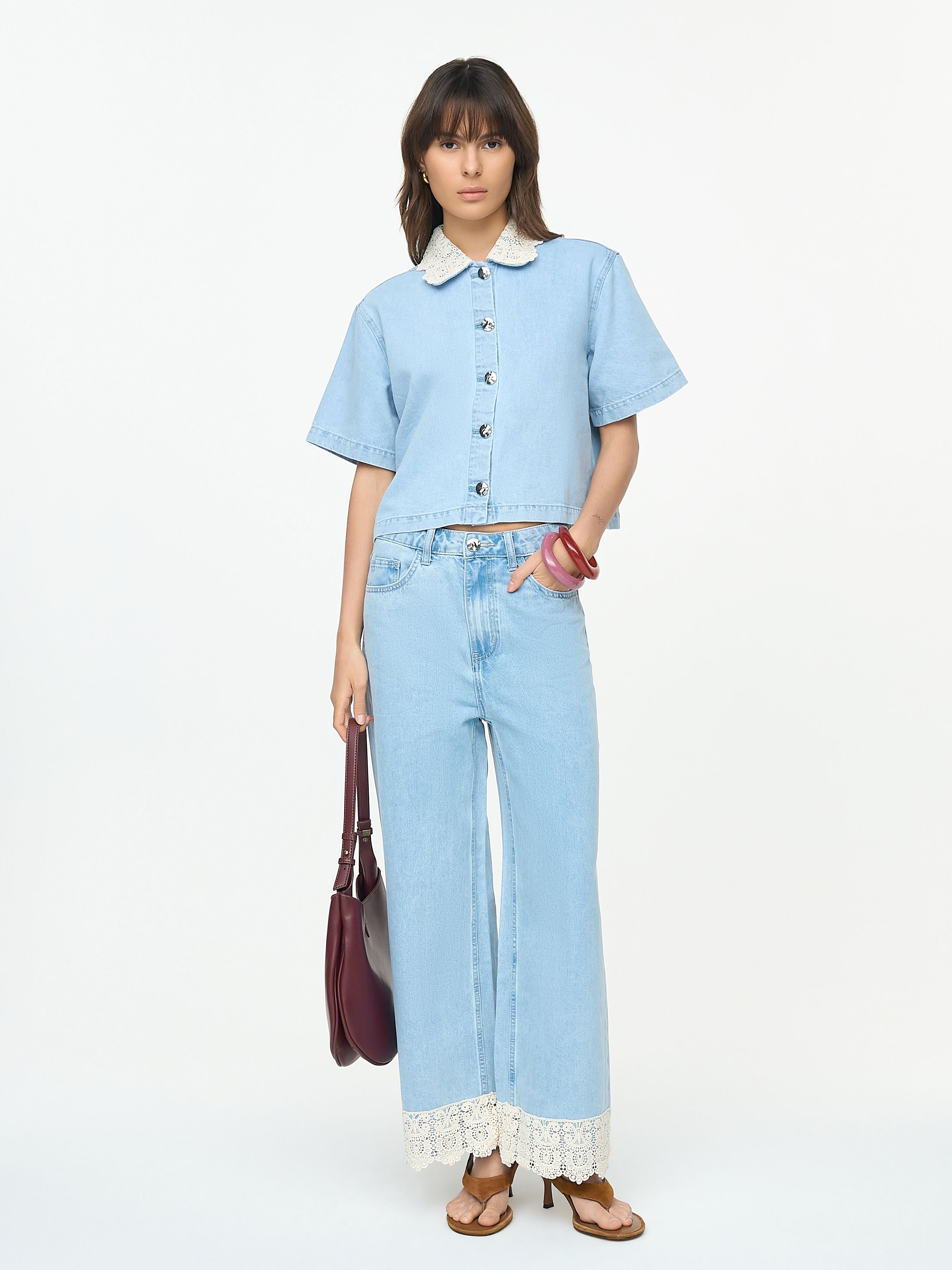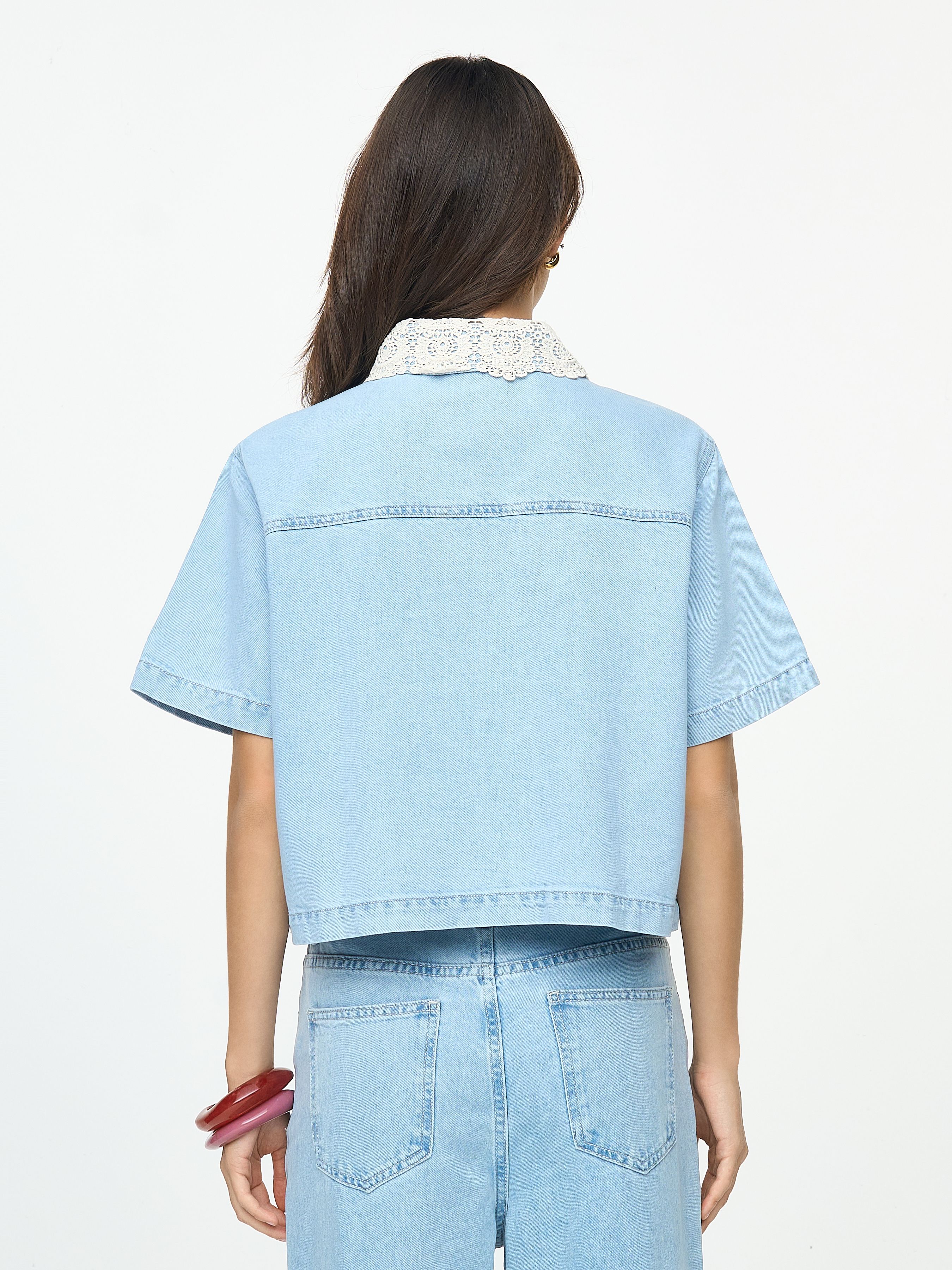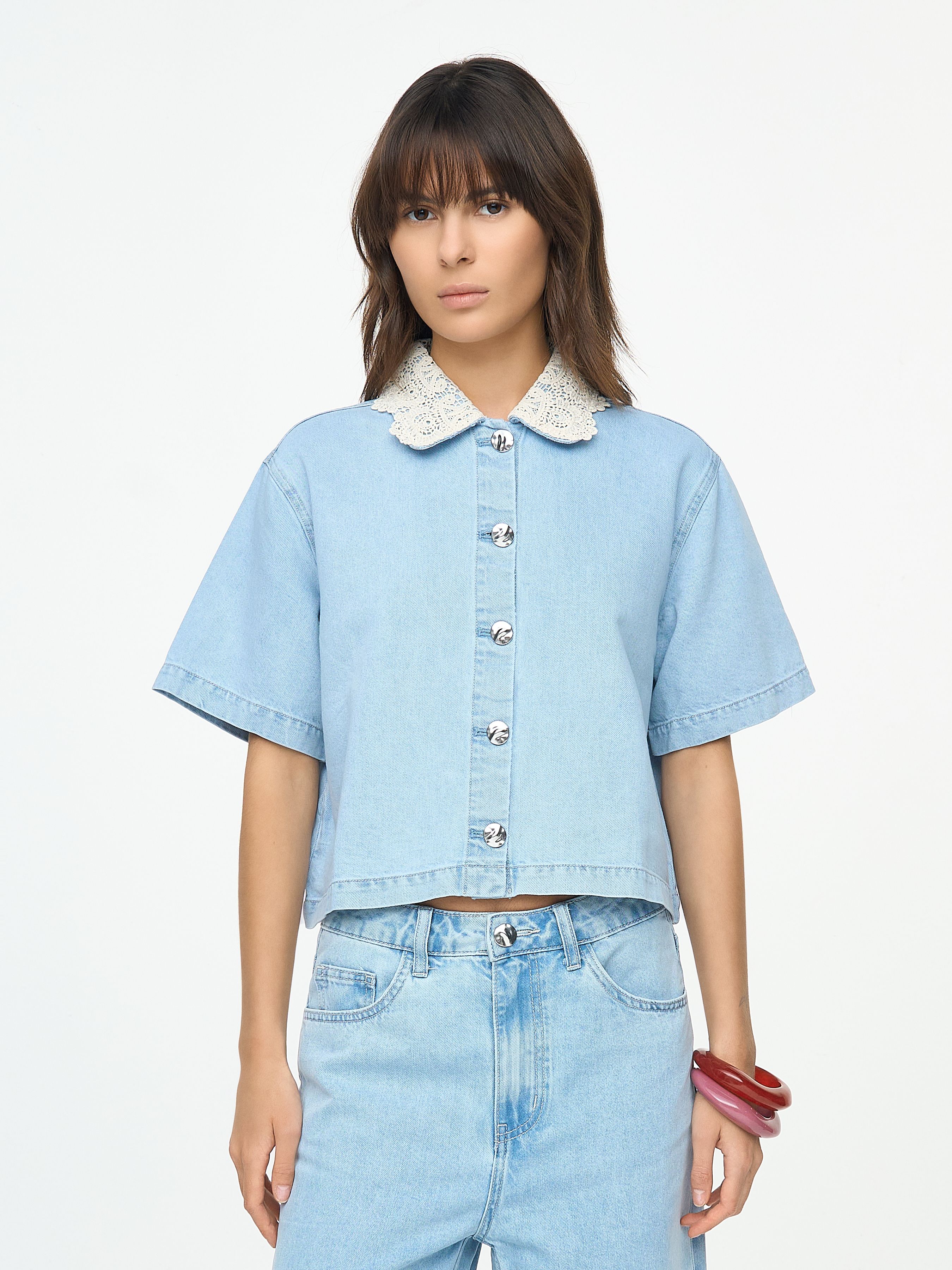 УКОРОЧЕННАЯ ДЖИНСОВАЯ РУБАШКА С ВОРОТНИКОМ ИЗ КРУЖЕВА КРОШЕ
