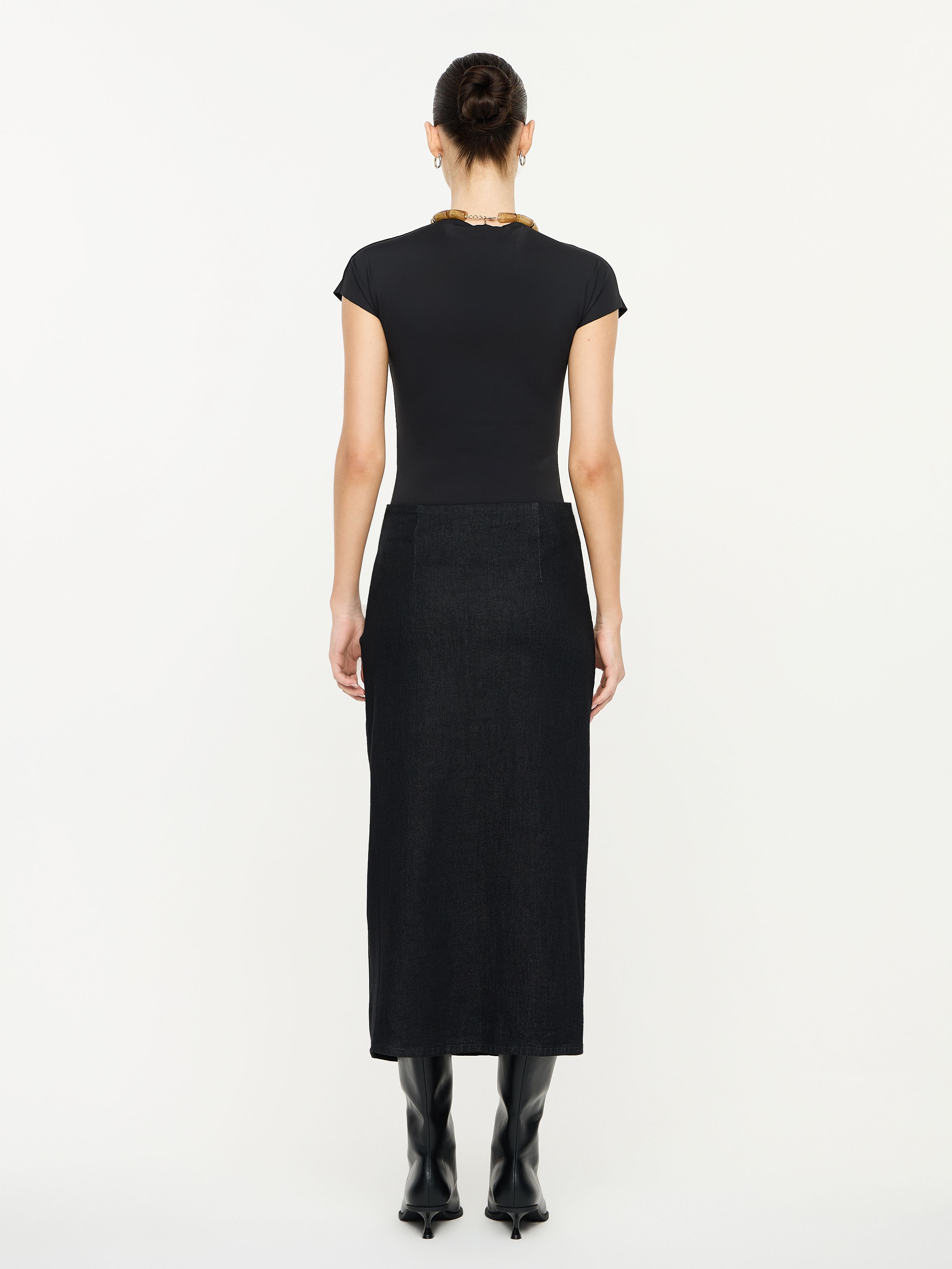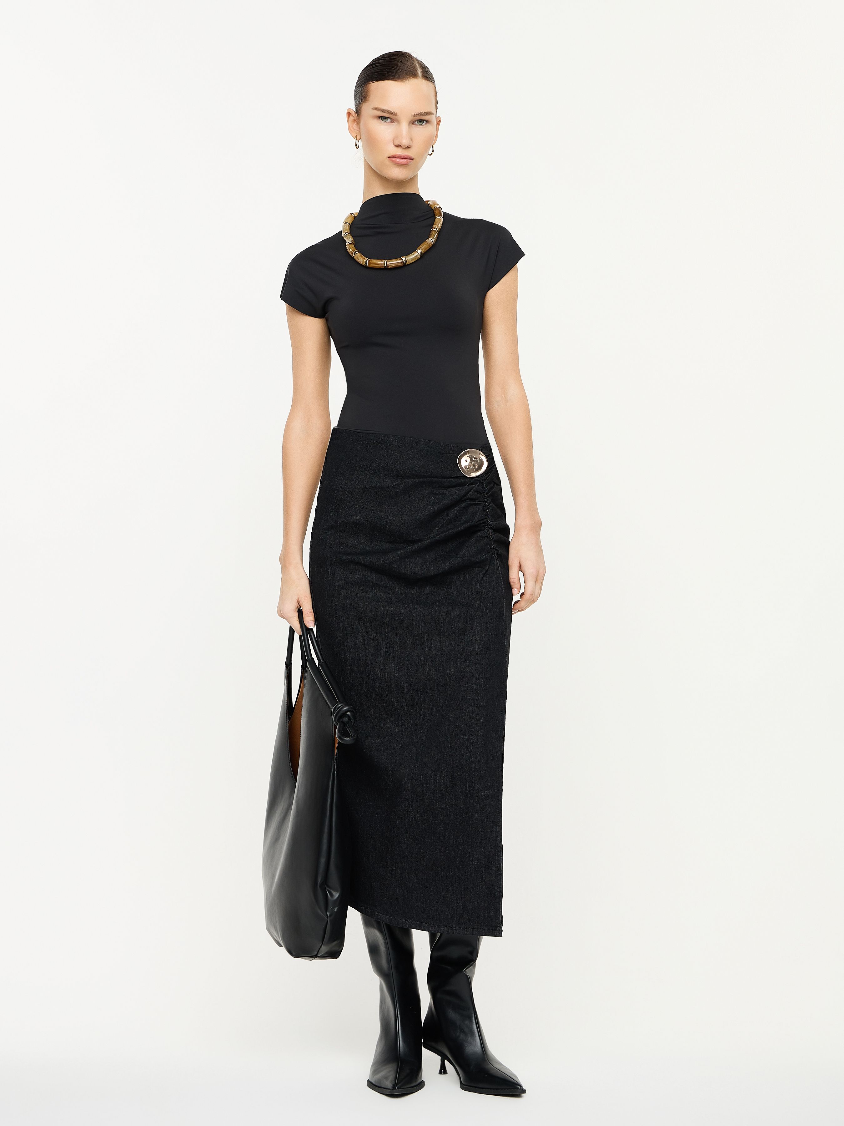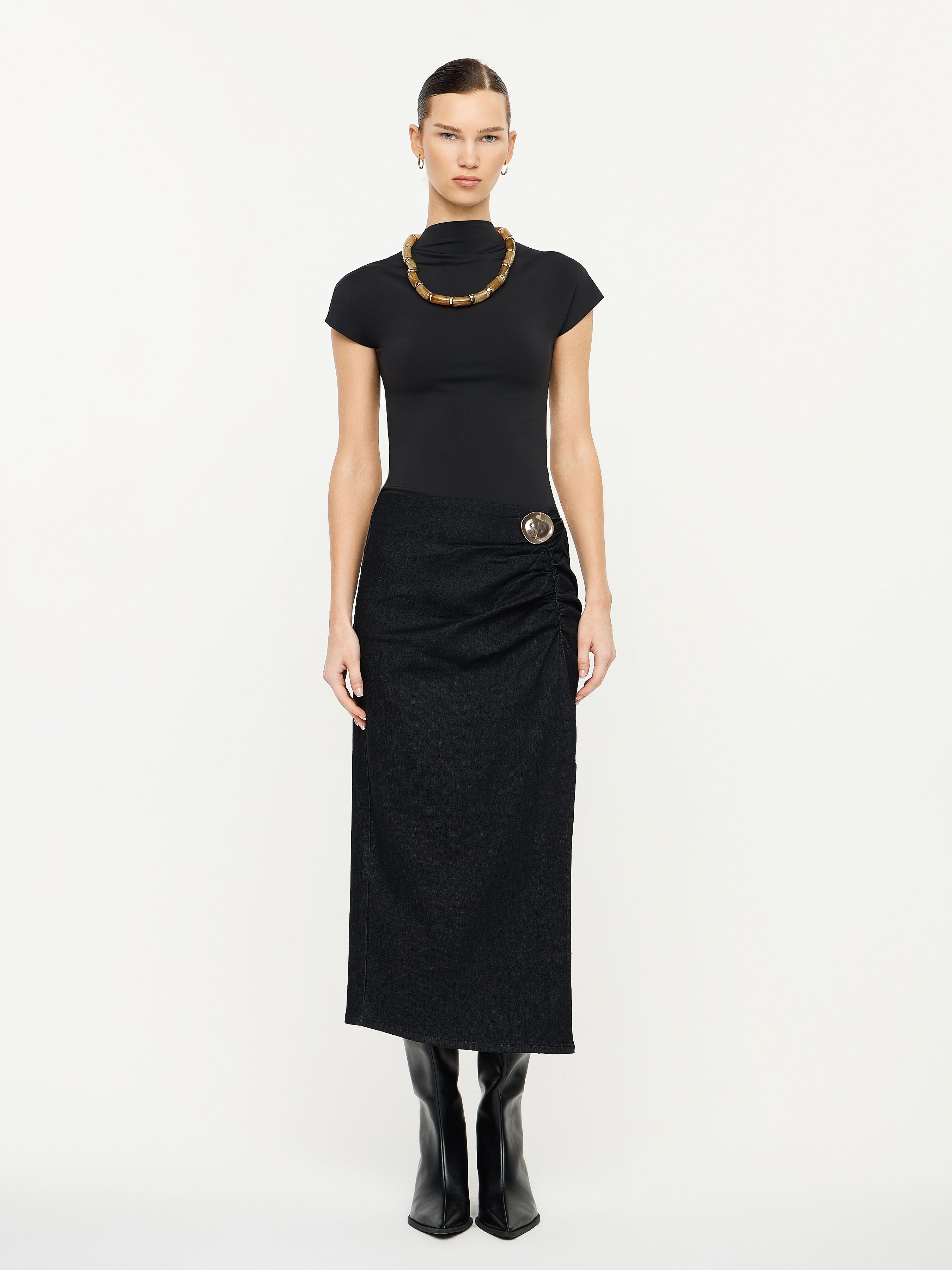 ДЖИНСОВАЯ ЮБКА МИДИ С ДРАПИРОВКОЙ И БРОШЬЮ